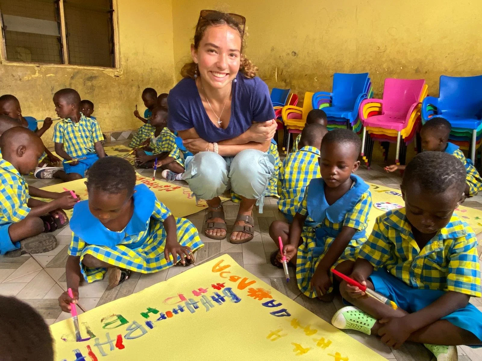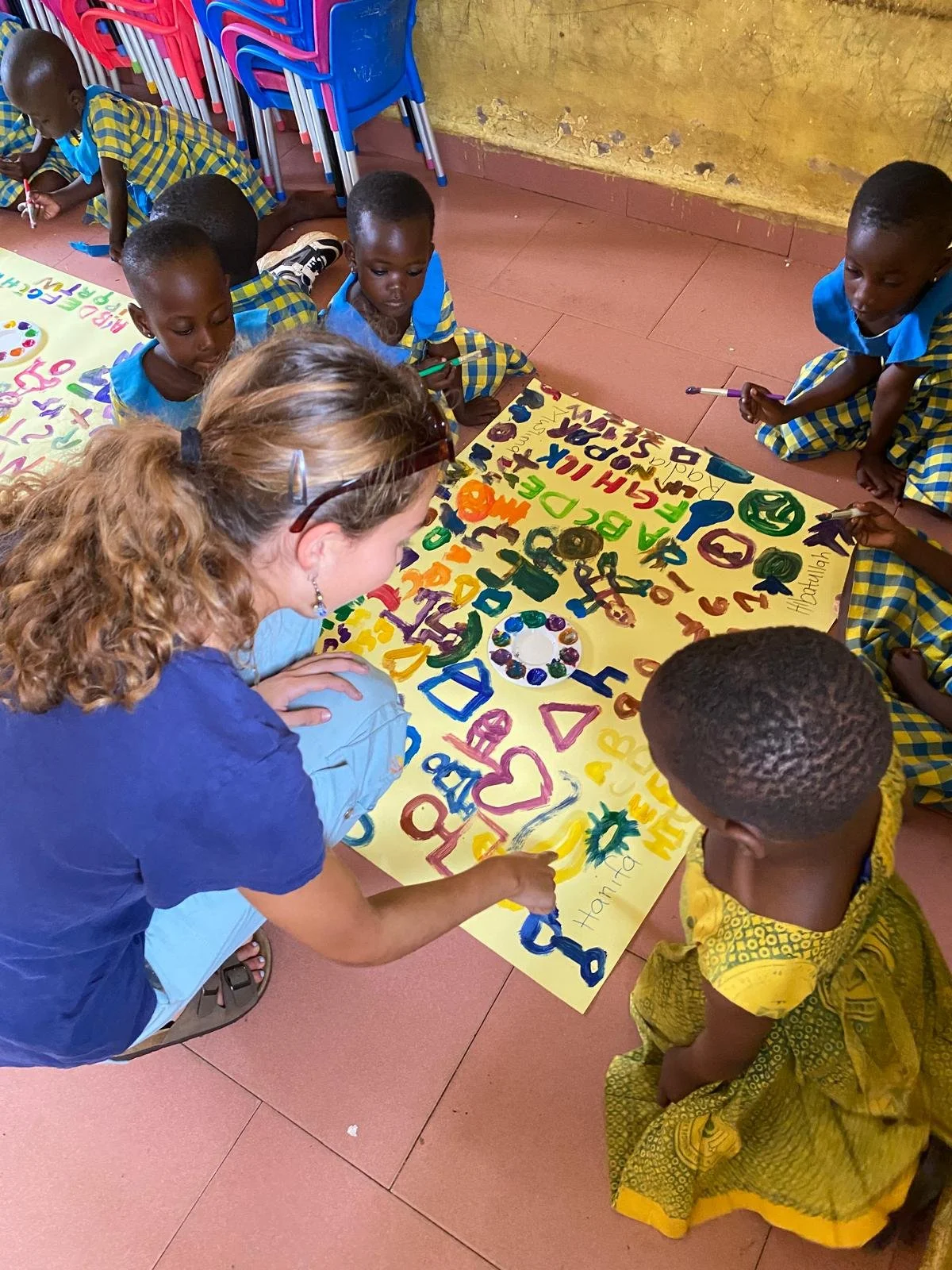In August 2024 Maya Coggeshall-Burr (17), a rising high school senior, headed to Hope for Children Academy in Bimbilla with her mother, Nadya Tkachenko, carrying 2 suitcases (over 100 pounds!) filled with colored pencils, paper and paint. Maya, an accomplished artist, was volunteering to give art lessons to about 300 children in each of the classes, nursery through 6th grades over four days.